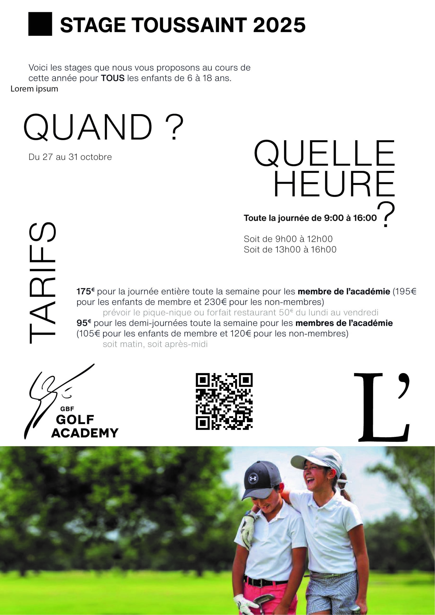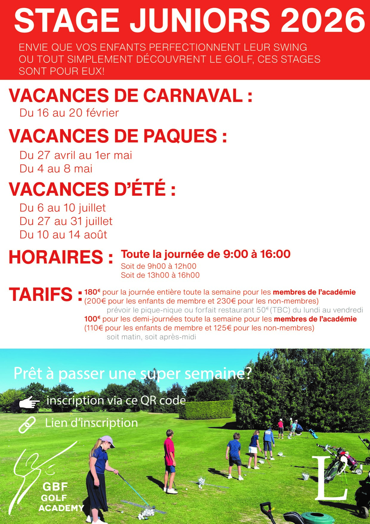 Que ce soit pour le plaisir ou pour viser la compétition, notre programme junior est le tremplin idéal pour libérer le potentiel de chaque jeune golfeur. Ne manquez pas cette chance unique de faire briller votre enfant sur le green !